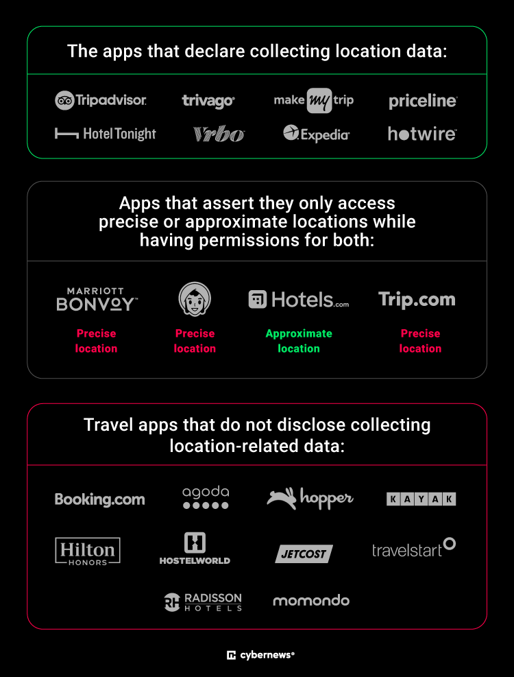 부킹닷컴, 아고다(Agoda), 하퍼(Hopper), 카약(Kayak), 힐튼 아너스(Hilton Honors) 등의 앱은 위치정보 권한을 요청하는지 공개하지 않았습니다.