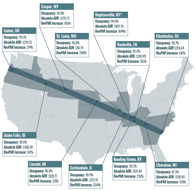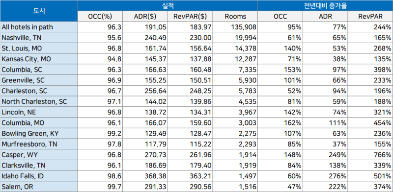 위 표는 개기일식을 관측할 수 있는 지역의 17년 8월 21일 호텔 실적입니다.