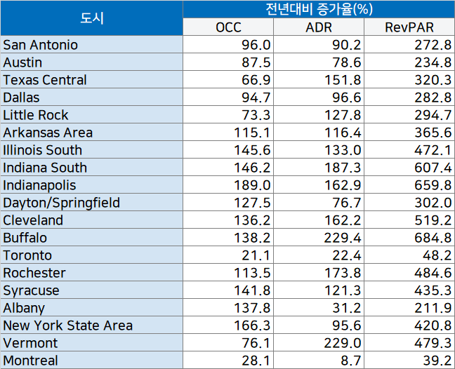 RevPAR가 가장 크게 증가한 도시는 역시 버팔로로 684.8% 증가했습니다.