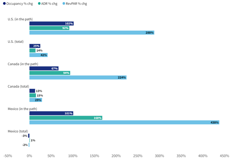 일식 경로의 도시에서는 OCC가 102%, ADR이 92%, RevPAR가 288% 증가했습니다.