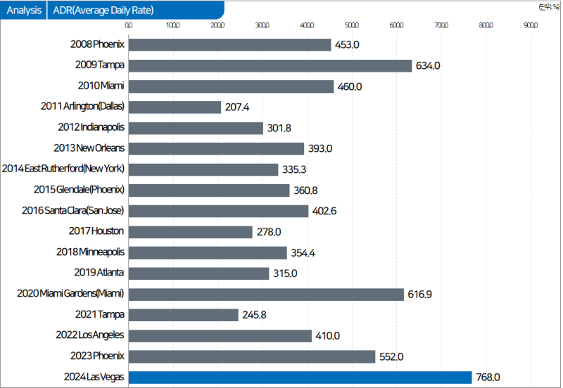 라스베가스의 ADR은 768달러로 슈퍼볼 역사상 가장 높은 ADR을 기록했습니다.