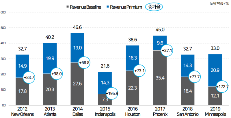 코로나 이전 슈퍼볼이 RevPAR에 미친 영향이 최소 110%에서 최대 1,100%까지 기백%에 달했던 것을 보면