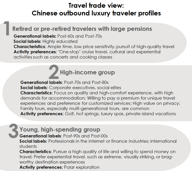고소득 여행자는 70대 및 80대 출생자(바링허우)로, 고급 숙소와 맞춤형 서비스에 대한 높은 요구가 있으며, 가족 단위 여행이 자주 이루어진다네요.