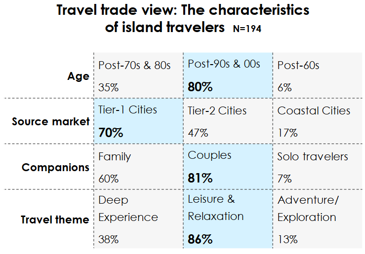 섬 여행객들은 주로 주링허우와 링링허우이며, 1군 도시(Tier-1 Cities) 출신의 커플들입니다.