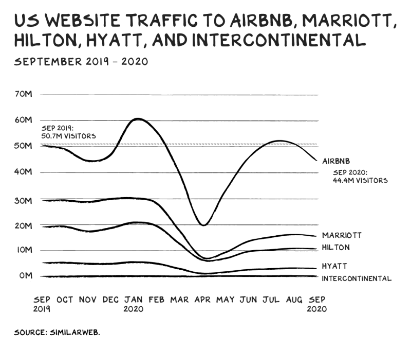반면, 기존 호텔 체인들의 트래픽수는 전년 대비 절반 수준에 그치고 있습니다.