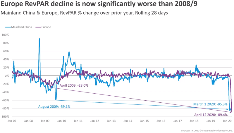 보시면 유럽과 중국 모두 RevPAR가 크게 하락한 것을 알 수 있습니다.