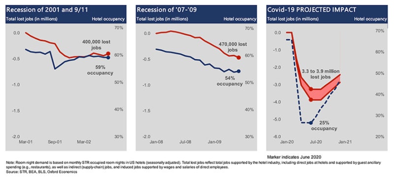 이번 코로나 사태는 실업자가 330만명 이상에 객실점유율이 20%까지 내려갔습니다.