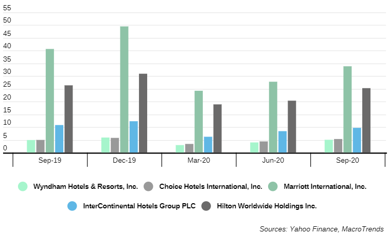 당연하게도 주요 호텔 상장기업들의 전년 대비 시가총액도 많이 하락했습니다.(단위: 10억 달러)