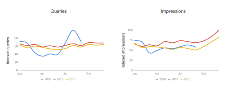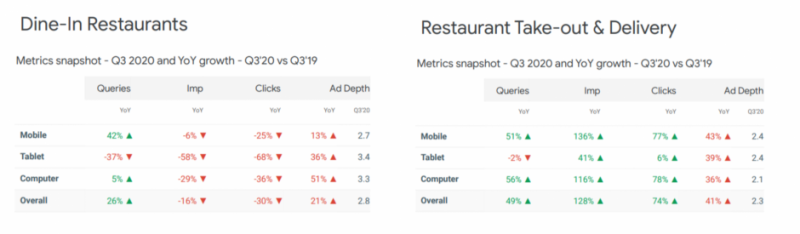 레스토랑에 방문해 식사하는 것과 관련해 검색 수(Queries)은 늘었으나, 광고 노출수(Impressions)는 감소했으며, 광고 클릭수도 줄어든 것을 볼 수 있습니다.
