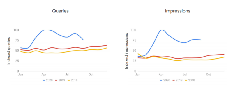 검색 수는 코로나 확산 후 크게 감소했다가, 봉쇄가 풀리면서 크게 증가했습니다.