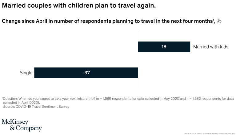 지난 4월 맥킨지의 조사에 따르면, 자녀가 있는 부부 계층은 싱글 계층에 비해 여행 계획이 더 많은 것으로 나타났습니다.