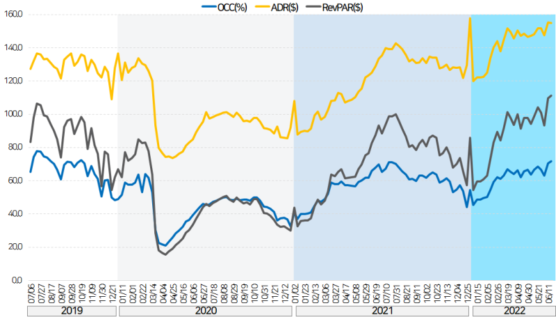 RevPAR(진한회색 선)을 살펴보면 ADR의 상승에 따라 가파른 상승세를 보이고 있습니다.