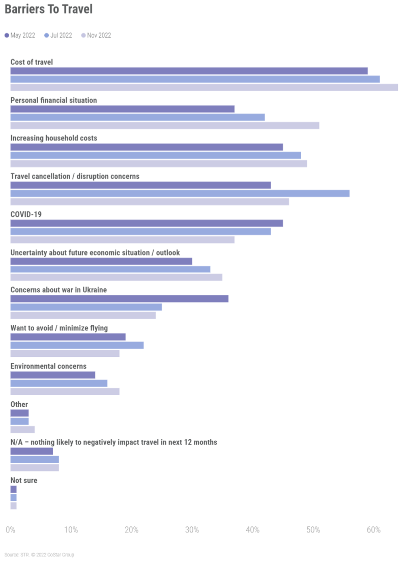 여행 비용, 개인 재무 상황, 가계 지출, 경제 상황이 제약요건이라는 비율이 점점 높아지고 있습니다.