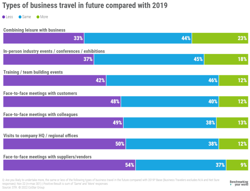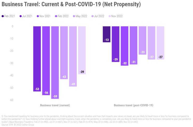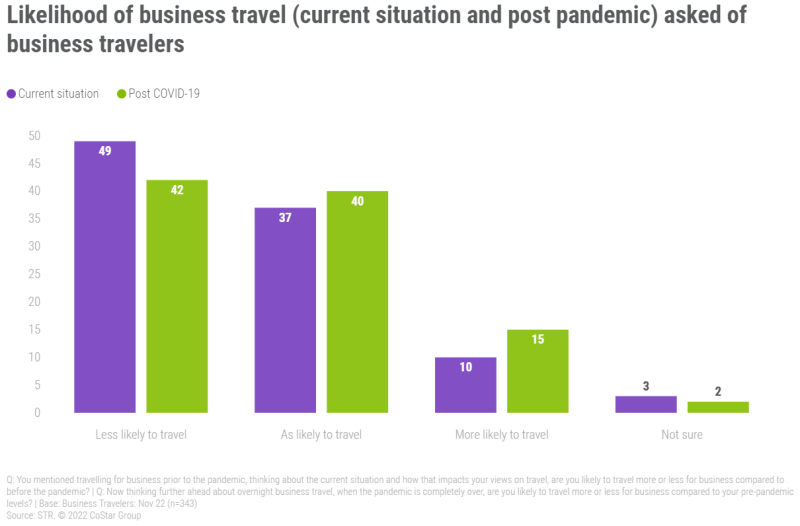 STR의 조사에 따르면 아직도 출장 수요는 코로나 이전에 비해 약 40% 낮은 상황입니다.