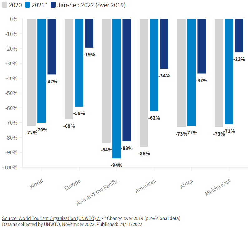 UN세계관광기구에 따르면 글로벌 관광이 코로나 이전의 65% 수준에 도달했다고 합니다.
