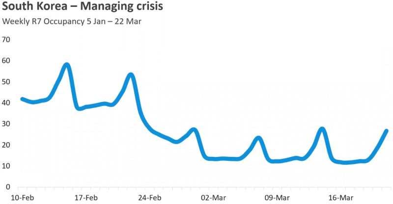 또한 안정 국면에 접어든 3월 중순 이후로는 주말의 객실점유율이 점점 오르고 있다는 점도 눈여겨 봐야 할 것 같습니다.