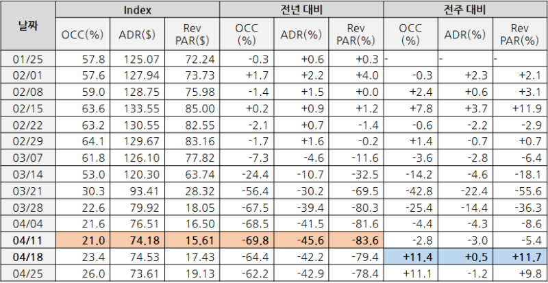 4/19~4/25일 호텔 실적-괄호 안은 전년 대비