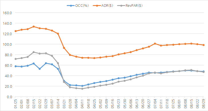 -RevPAR(Revenue per available room): $47.38(-44.5%)