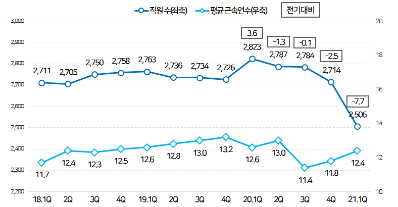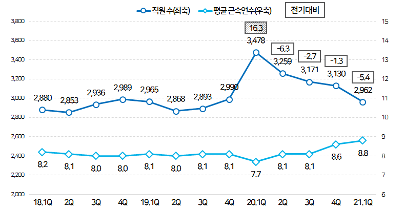결과적으로 2021년 1분기 직원 수는 전년동기대비 11% 정도 감소했습니다.