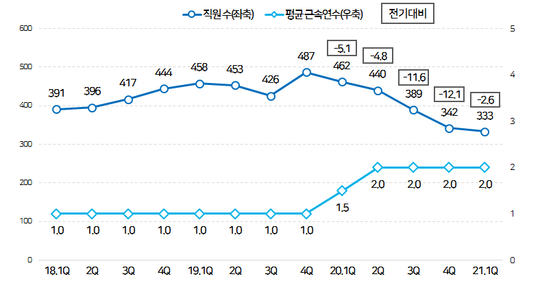 위에서 살펴본 것처럼 직원 수도 줄고 경력이 많지 않은 직원들의 비중이 늘면서,