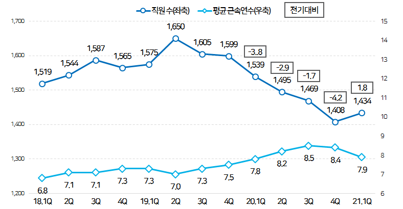 1년이 지난 시점인 2021년 1분기 근속연수가 8.8년으로 1년 이상 증가한 것을 보면