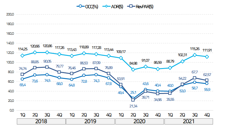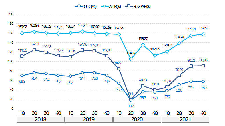 ADR은 112달러까지 상승하면서 사실상 코로나 이전 수준을 회복했습니다.