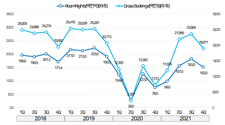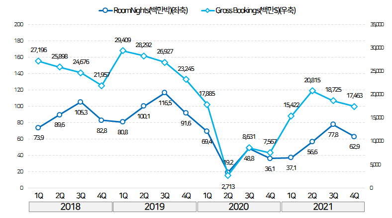 익스피디아의 RoomNights는 기존 약 100만 박에서 코로나 시기 19만 박까지 떨어졌다가