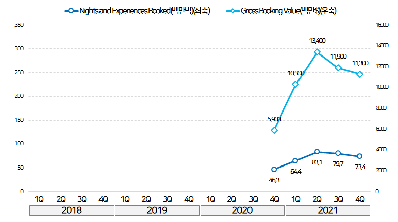 Gross Bookings(이용자 지불 총액, 해당 OTA를 통해 고객들이 지불한 금액-수수료가 아닌 실제 총 지불 금액, 숙소/항공/액티비티 등 포함)(단위:$/유로) - 에어비앤비는 "Gross Booking Value"