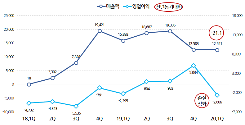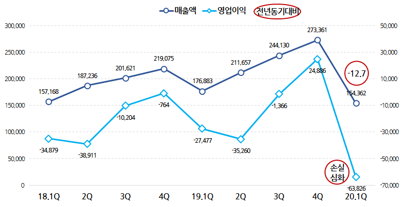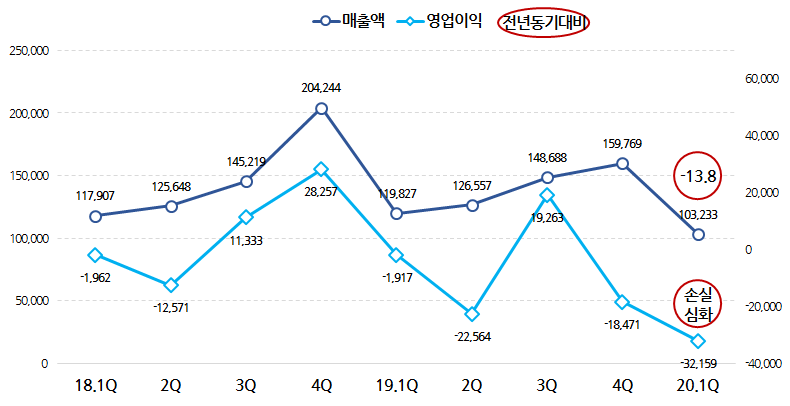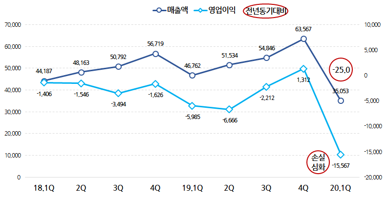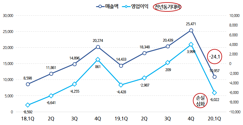 작년에 약 230억원대의 영업손실을 기록했는데, 1분기에만 벌써 320억 손실입니다.