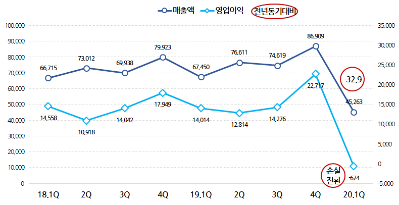 18.2분기 이후 지속적으로 이익을 기록하던 영업손익은 이번에 손실로 전환되었습니다.