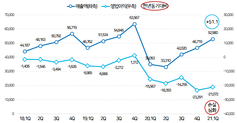다만 영업손실은 약 210억 수준으로 전년 동기 대비 손실 폭이 커졌습니다.