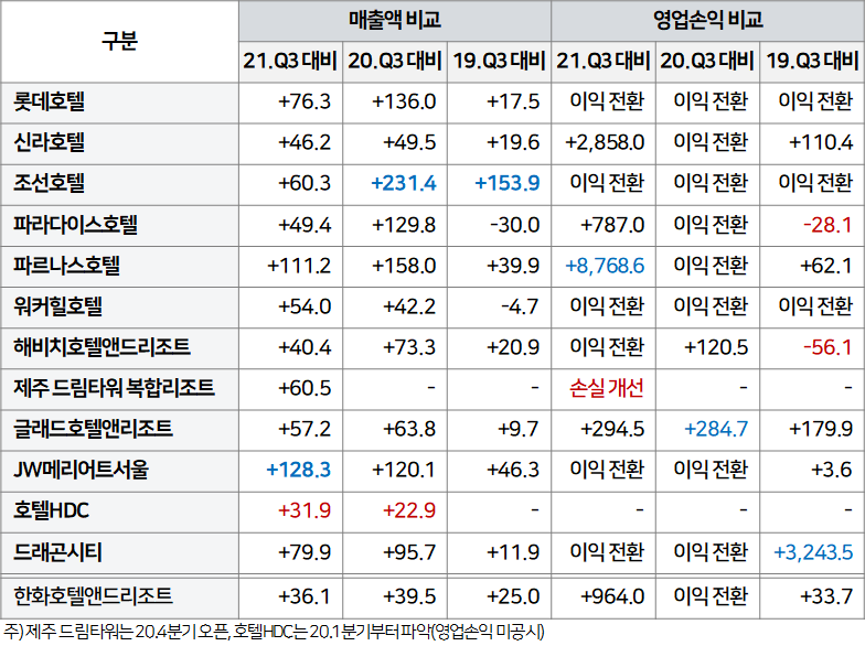 코로나 이전인 2019년 3분기에 비해서도 이익이 증가한 호텔들이 많았습니다.