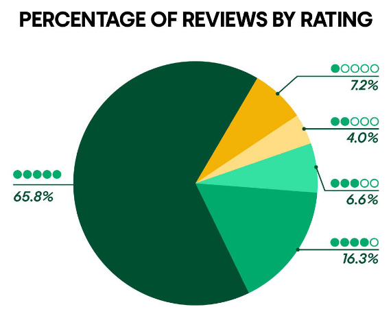 리뷰의 평점 비율을 보면 5점을 준 리뷰가 65.8%로 가장 많았습니다.