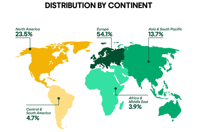 지역별로는 유럽이 약 54.1%의 비율로 가장 많은 비중을 차지했으며,