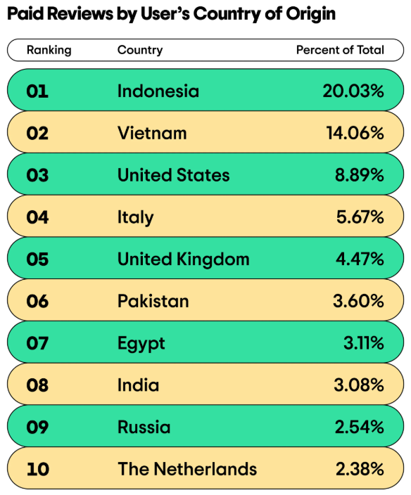 돈을 받고 리뷰를 쓴 사람들의 국가를 분석한 결과,