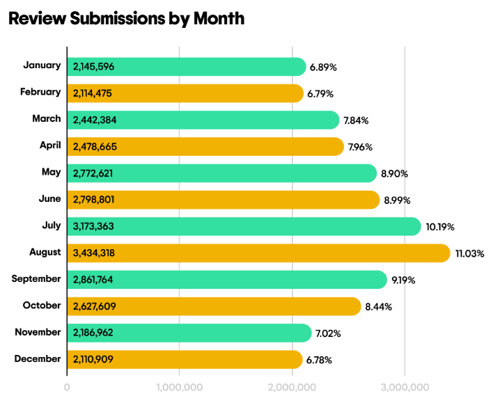 8월이 343만개로 11%가 넘는 점유율을 보이여 가장 리뷰가 많은 달로 꼽혔습니다.