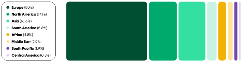 지역별로는 유럽의 리뷰 수가 50%에 달했습니다.