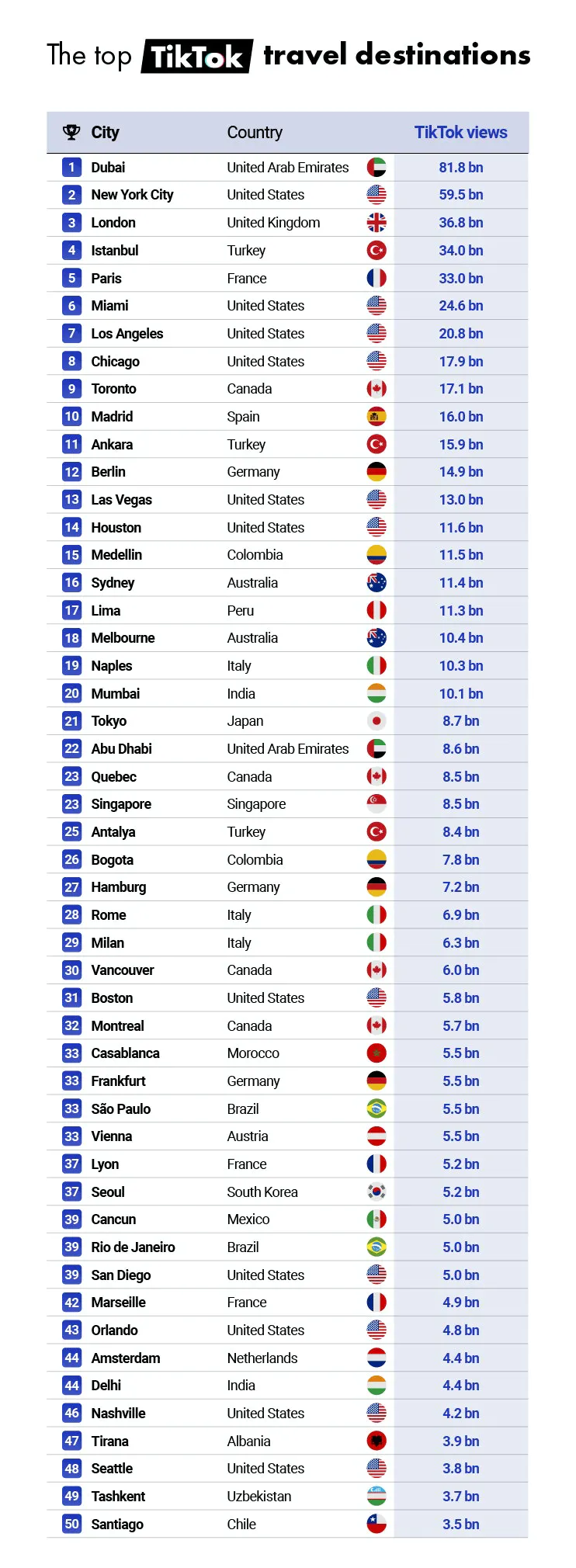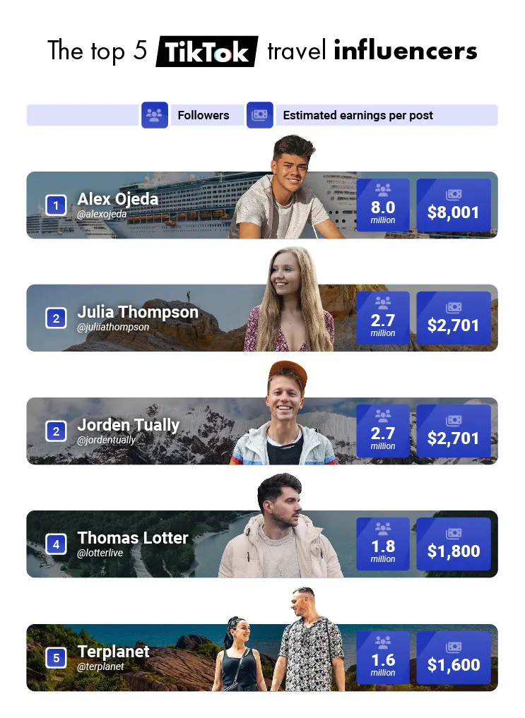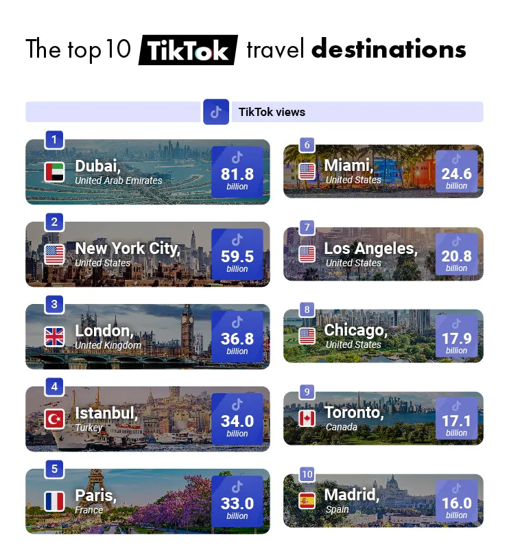 틱톡의 조회수를 기반으로 가장 인기있는 여행지 및 여행 인플루언서 순위를 매겼는데요.