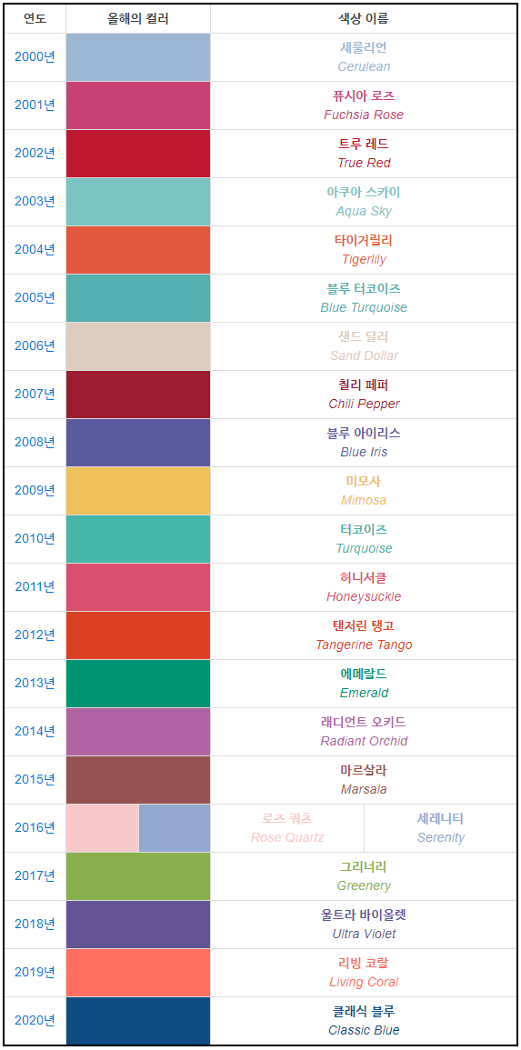 팬톤은 2000년부터 올해의 컬러를 선정해오고 있는데요.