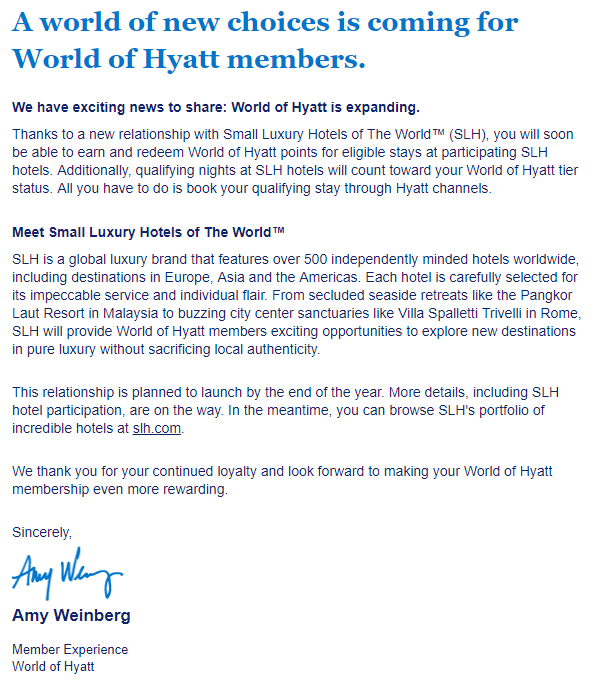 CHICAGO (August 1, 2018) – Hyatt Hotels Corporation (NYSE: H) and Small Luxury Hotels of the World™ (SLH) today announced plans to bring World of Hyatt members opportunities to enjoy loyalty benefits in many more places. The launch is targeted fo