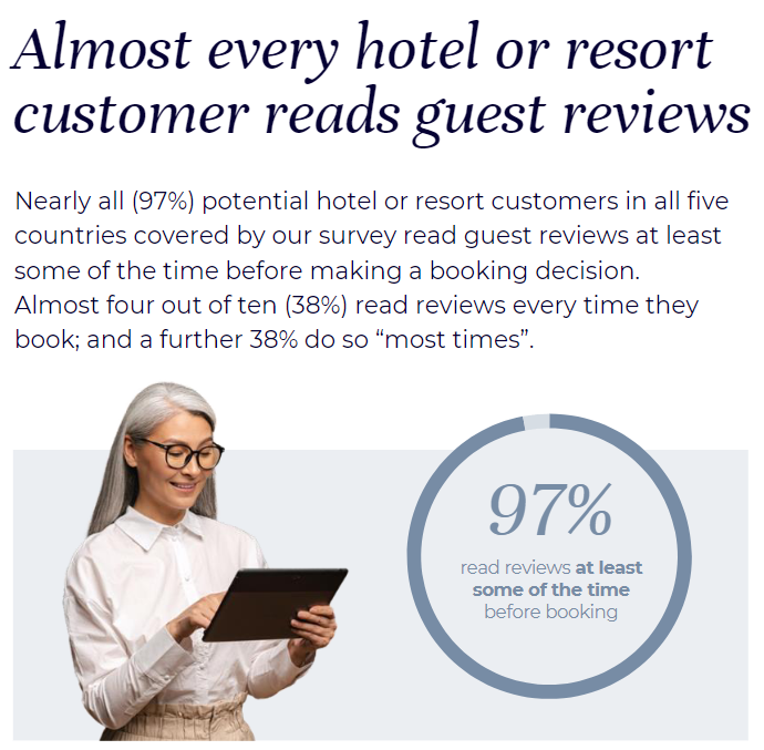 조사 결과 97%의 고객이 가끔씩 예약 전 게스트 리뷰를 읽는 것으로 나타났습니다.