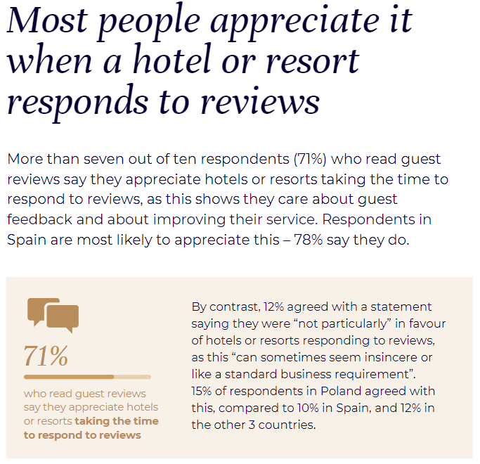 고객들의 71%가 호텔이 리뷰에 응답하는 것을 긍정적으로 평가했습니다.