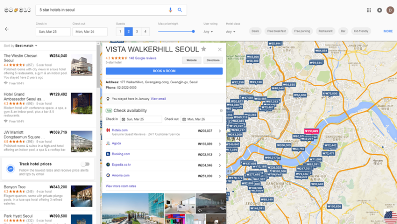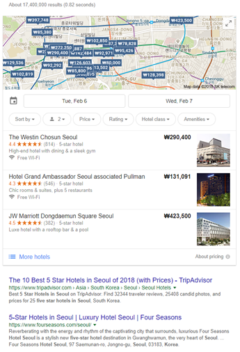 또 "5 star hotels in seoul"과 같은 식으로 지역의 호텔을 검색하면그 지역의 호텔들의 가격을 비교해 검색해 줍니다.