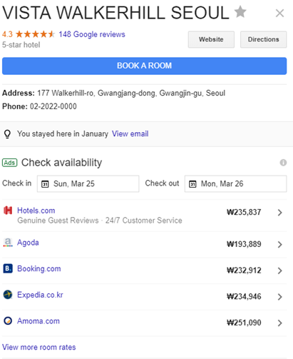 OTA를 비교 검색해주는 메타서치(Metasearch)가 하는 역할을 구글이 검색 결과에서 다 해버리는 것입니다. 이것도 모자라 호텔을 검색하는 전용 검색페이지를 만들어 버립니다.