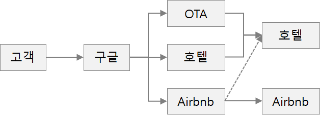 위는 현재 여행 시 숙소 예약 순서를 아주 간단히(후려쳐서?) 도식화시켜본 것입니다. (사실 가장 첫 포스팅에 넣었어야 했는데;;; 이제야 생각나서 넣었습니다...;;; 여기나 거기나...ㅎㅎ) 고객은 구글에 검색을 합니다. (구글 외 페이스북도 노력은 하고 있으나...넘나 차이가 나는 것...) 그리고 OTA나 호텔 홈페이지나 Airbnb(에어비앤비)로 들어갑니다. 이후 호텔이나 Airbnb에 예약을 하게 되죠. (Airbnb에서 호텔로 이어진 점선은 최근 Airbnb에서 발표한 부띠크 호텔 예약 시스템을 표기) 이걸 보면 호텔 예약의 이해관계자들은 구글, OTA, Airbnb, 호텔 인데요. (고객은 살포시 제외해 봅니다..) 호텔 예약 시장이 커지고는 있지만, 결과적으로 한정된 시장을 나눠 먹고 있는 것이지요. 따라서 이 4개의 이해관계자들의 관계가 중요할 텐데요. 간단히 관계를 살펴보겠습니다. 4명의 이해관계자이니 아래와 같이 총 6가지의 관계가 나올텐데요. ① 구글-호텔 ② 구글-OTA ③ 구글-Airbnb ④ 호텔-OTA ⑤ 호텔-Airbnb ⑥ OTA-Airbnb 하나하나씩 정리해 보시죠. **① 구글-호텔 **우선 구글과 다른 이해관계자들의 관계를 살펴보겠습니다. 구글과 호텔(특히 대형호텔체인)은 협력 관계로 보입니다. 구글 입장에서는 OTA에게 돈을 받나, 호텔에 돈을 받나 차이가 없으나, 지속적인 인수합병을 통해 규모가 커진 대형 호텔 체인은 구글에게 OTA보다 더 달콤한 제안을 할 수 있겠죠. 그래서 지난 포스팅에서 전해드린대로 키워드 검색을 없어버린다거나 하는 거래를 하는겁니다. **② 구글-OTA **구글이 호텔과 협력함에 따라 자연스레 OTA와는 멀어지고 있습니다.고객이 OTA로 유입되는데 큰 역할을 하는 키워드 광고를 제한하니 당연한 일이겠죠. 물론 기본적으로는 협력 관계입니다. **③ 구글-Airbnb **구글과 Airbnb의 관계는 나중에 한 번 별도로 다뤄보겠습니다. 물론 호텔 예약에 있어 둘의 관계가 나쁠 이유가 없겠죠? **④ 호텔-OTA **호텔과 OTA의 관계는 적대적 공생이라는 말이 정확할 것 같습니다. 앞선 포스팅에서도 적어드렸듯이 호텔도 모든 예약을 Direct Booking으로 받을 때보다 OTA가 존재하는게 투숙률을 높일 수 있는 길이라는 것을 알고 있습니다. OTA도 호텔로부터 수수료를 받아야 살아남을 수 있구요. 그러나 호텔은 언제나 Direct Booking을 선호하기 때문에 다양한 방법을 동원했고, 지난 포스팅에서 말씀드린대로 그 방법은 성공적인 것으로 보입니다. **⑤ 호텔-Airbnb **호텔과 Airbnb의 관계는 어떨까요? 둘의 관계는 얼핏 보면 적대적 공생도 아닌 단순 적대적 관계라고 볼 수 도 있는데요. 적어도 현재 4성 이상 호텔에서는 큰 관계가 없어보입니다. 최근 나오는 연구 결과들을 보면 Airbnb를 이용하는 고객은 애초에 고급호텔을 이용할 가능성이 낮아서 호텔의 매출에 큰 영향을 미치지 못하고 있다고 합니다. (해당 연구들은 2014~2015년까지의 데이터를 가지고 연구한 결과라 최근에는 어떤 영향을 미치고 있는지 좀 더 두고볼 필요가 있습니다.) 물론 지난 2월 Airbnb가 부띠크호텔 예약을 중개하겠다고 한 시점에서 적대적인 관계가 형성되고 있을 수도 있을 것 같습니다. 부띠크 호텔 예약 중개를 모든 호텔 예약 중개로 변경하는 것은 어려운 일이 아니니까요. 따라서 이 관계는 좀 더 시간이 지나야 겠지만 아마도 적대적 관계로 변경될 가능성이 높다고 보입니다. **⑥ OTA-Airbnb **OTA와 Airbnb의 관계는 슬슬 적대적으로 바뀌고 있습니다. 구글과 대형 호텔 체인에 치이고 있는 OTA에게 점점 중요해지는 중소형 및 독립 호텔들의 예약에 대해 Airbnb도 중개하겠다고 나섰으니까요. 이런 상황을 살펴보면, OTA는 대체로 다른 이해관계자들과 부정적인 관계를 맺고 있습니다. 이게 OTA만의 잘못은 아니겠지만... 그동안 너무 잘나간데에 따른 반작용이라고 볼 수 있을 것 같습니다. 그럼 OTA가 다른 이해관계자들과의 경쟁 탓으로 점점 더 추락하는 것을 지켜만 보고 있을까요? 인간의 욕심은 끝이 없기 때문에 당연히 그렇지 않겠죠? OTA도 살 길을 모색합니다. 위기를 극복하는 방법은 여러가지가 있겠죠. 그런데 크게 보면 두 가지로 나눌 수 있을 것 같습니다. 강점을 강화하는 것, 약점을 보완하는 것. 그럼 OTA의 강점과 약점은 무엇일까요? 현재 OTA의 가장 큰 강점을 많은 고객을 보유하고 있다는 것입니다. 가장 큰 약점은 보유한 많은 고객들이 가격에 상대적으로 민감한 고객들이라는 것입니다. 그럼 OTA는 위기를 극복하기 위해 어떤 선택을 했을까요? 정답은 둘 다 입니다. 고객 수를 확보하고, 그 고객을 자신의 사이트에 종속(Lock-in)시키는 것이죠. 강점을 강화하기 위해서는 더 많은 고객을 확보하는 것이 필요하겠죠? 그럼 어떻게 하면 더 많은 고객을 회원으로 가입시킬 수 있을까요? 또 약점을 보완하기 위해 회원 가입한 고객을 계속 이용하게 만들려면 어떤 방법이 있을까요? 가장 간단한 방법은 최저가로 제공하는 호텔 리스트를 늘리는 겁니다. 그러나 앞서 호텔들이 OTA에게 최저가를 내어주지 않는다고 말씀드렸죠? 또 대형 호텔들은 이미 다 리스트를 제공하고 있기 때문에 중소형 호텔의 리스트를 늘려야 하는데, 이는 비용이 소모되기 마련이고, Airbnb도 유사한