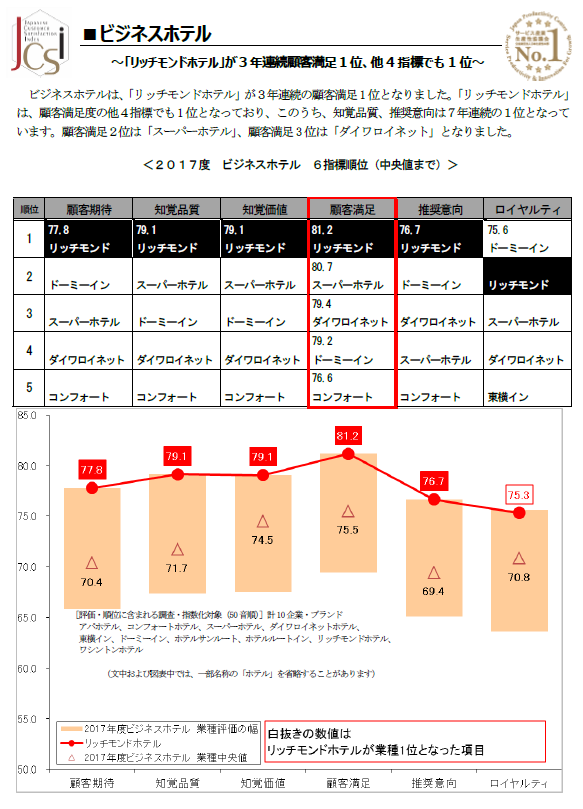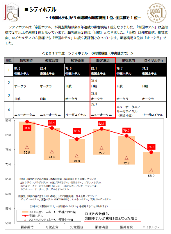 2017년 JCSI(Japan Customer Satisfaction Index) 결과 일본 호텔 고객만족도 순위