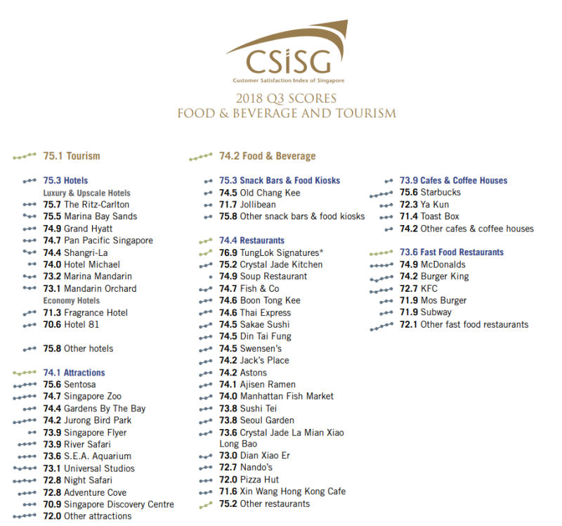 2018년 CSISG(The Customer Satisfaction Index of Singapore) 결과 싱가포르 호텔 고객만족도 순위