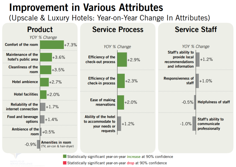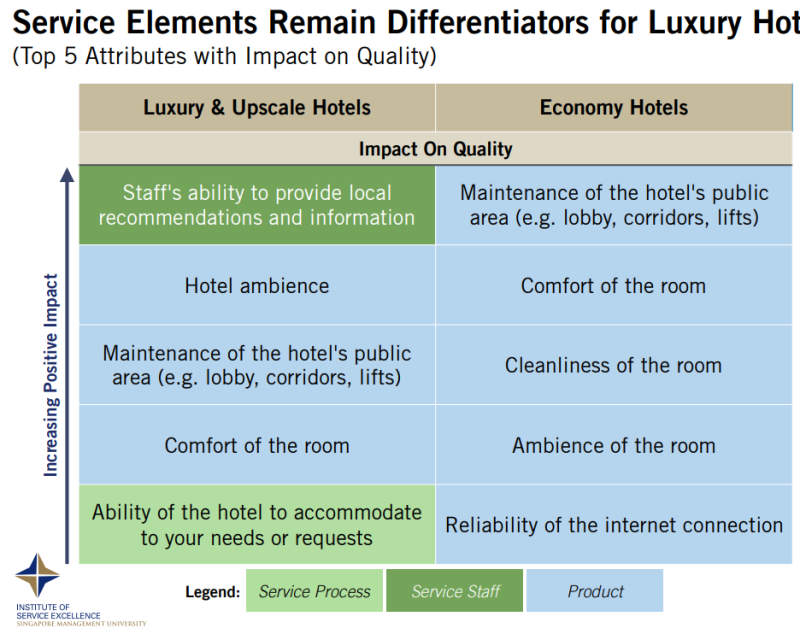 표를 보시면 아시겠지만, 이코노미는 대체로 시설 관련 요인이 다수인 반면, 5성급에서는 직원과 프로세스 역시 중요한 것으로 나타났습니다.