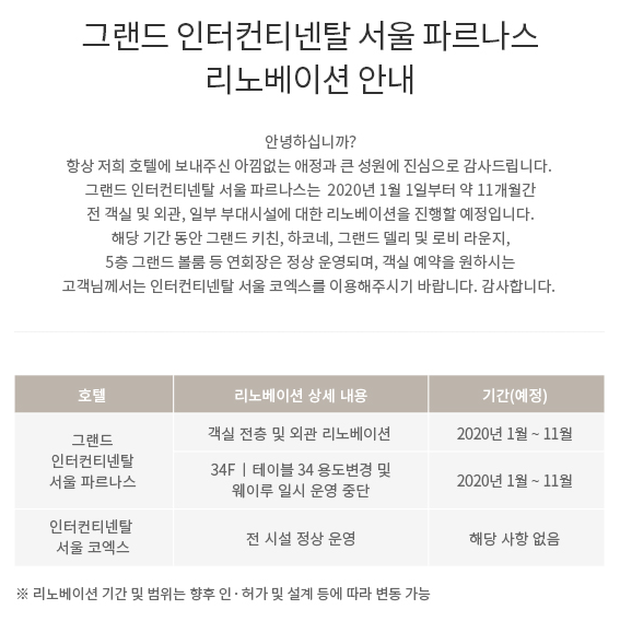 *그랜드 인터컨티넨탈 서울 파르나스 리노베이션 안내*