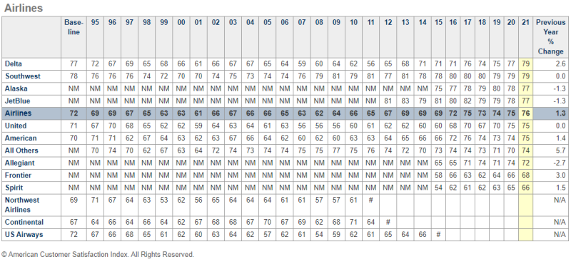 1995년 조사 이래 5번을 제외하곤 늘 1위에 위치했던 사우스웨스트항공을 제쳤네요.